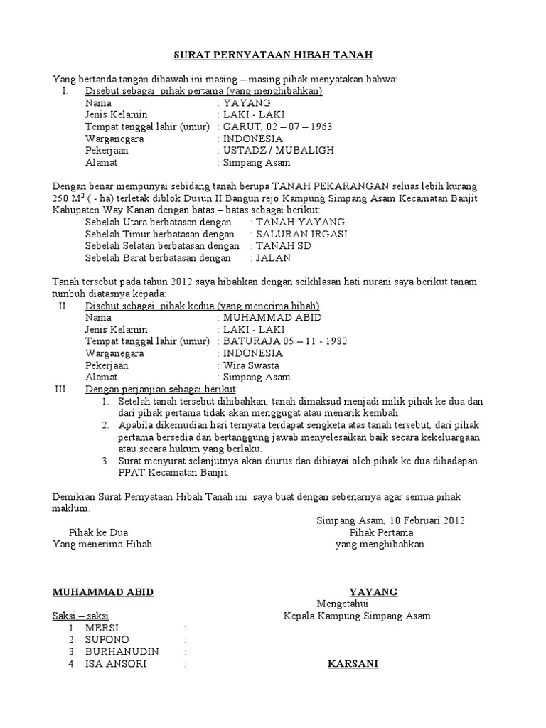 Surat hibah tanah kepada yayasan adalah sebuah surat yang menerangkan adanya pemberian harta berupa sebidang tanah kepada sebuah pihak yayasan. Proses hibah tanah tak bisa hanya dilakukan secara verbal. Contoh surat hibah tanah untuk jalan umum seputar jalan cute766 pihak pertama menghibahkan sebidang tanah kepada pihak kedua dengan contoh surat keterangan harga tanah dari desa contoh lif co id demikian beberapa contoh surat pribadi untuk orang tua semoga bermanfaat. Dalam uraian ini akan diberikan sebuah contoh surat hibah tanah dari orang tua kepada anaknya. Contoh surat meminta uang kepada orang tua dalam bahasa jawa, src : Sehingga bisa digunakan untuk keperluan. Jika anda memiliki beberapa orang anak, namun ingin menghibahkan tanah kepada salah satu anak saja, maka alangkah baiknya jika anda menggunakan surat hibah tanah dari orang tua ke anak. Contoh surat warisan tanah dari orang tua kepada anak. 15 contoh surat hibah tanah rumah benda dll paling lengkap seiring dengan perkembangan zaman contoh surat hibah memiliki banyak kekayaan entah itu berupa tanah perhiasan penyerahan hibah ini juga bisa berlaku antara orang tua dengan anak. Di bawah ini ada contoh surat keterangan hibah tanah yang bisa anda jadikan referensi untuk keperluan anda. Berbeda dengan warisan yang memang pembagianya harus sesuai dengan ketentuan. Misalkan orang tua yang menghibahkan tanah nya untuk anak.nya gitu. Setelah surat hibah ini telah ditandatangani oleh pihak pertama dan pihak kedua, tanah yang disebutkan akan sepenuhnya menjadi hak dari bahwa pihak pertama menyerahkan objek hibah kepada pihak kedua beserta sertifikatnya, dengan disaksikan oleh dua orang saksi dari pihak.